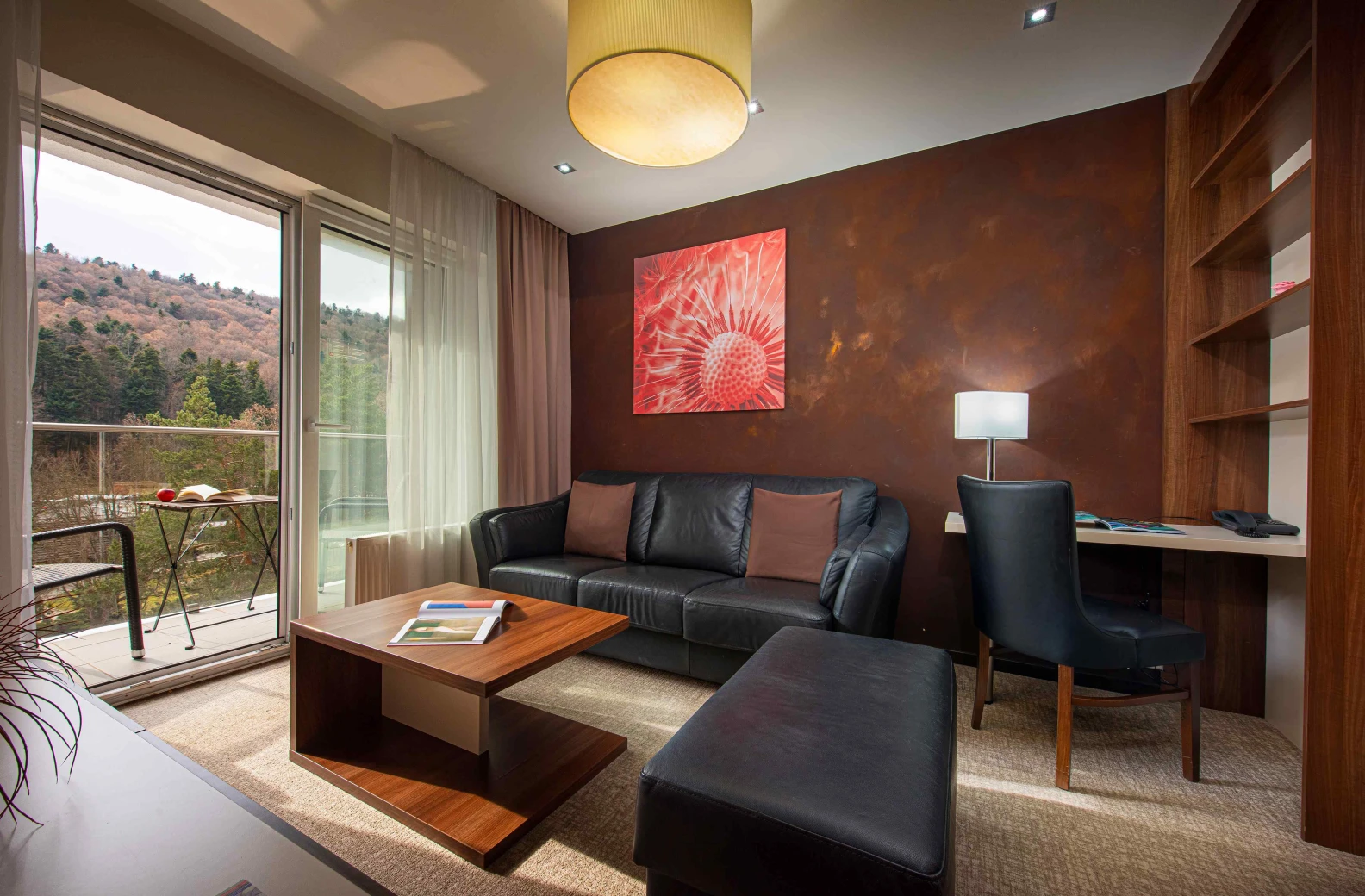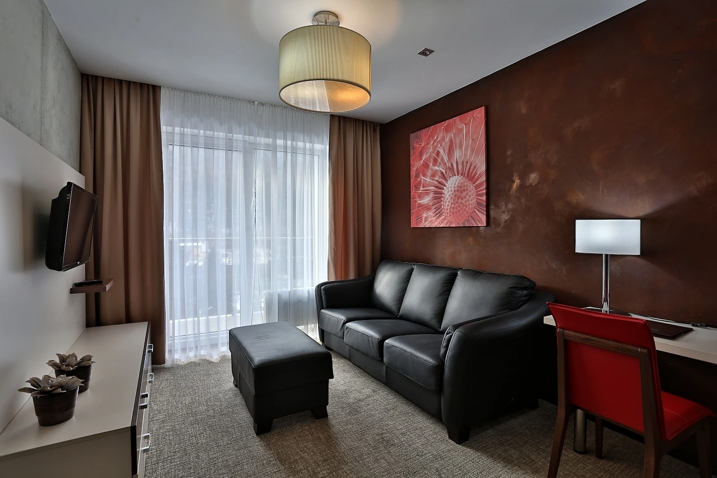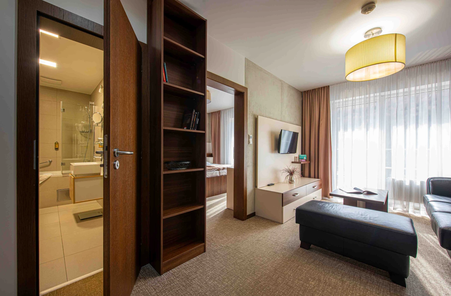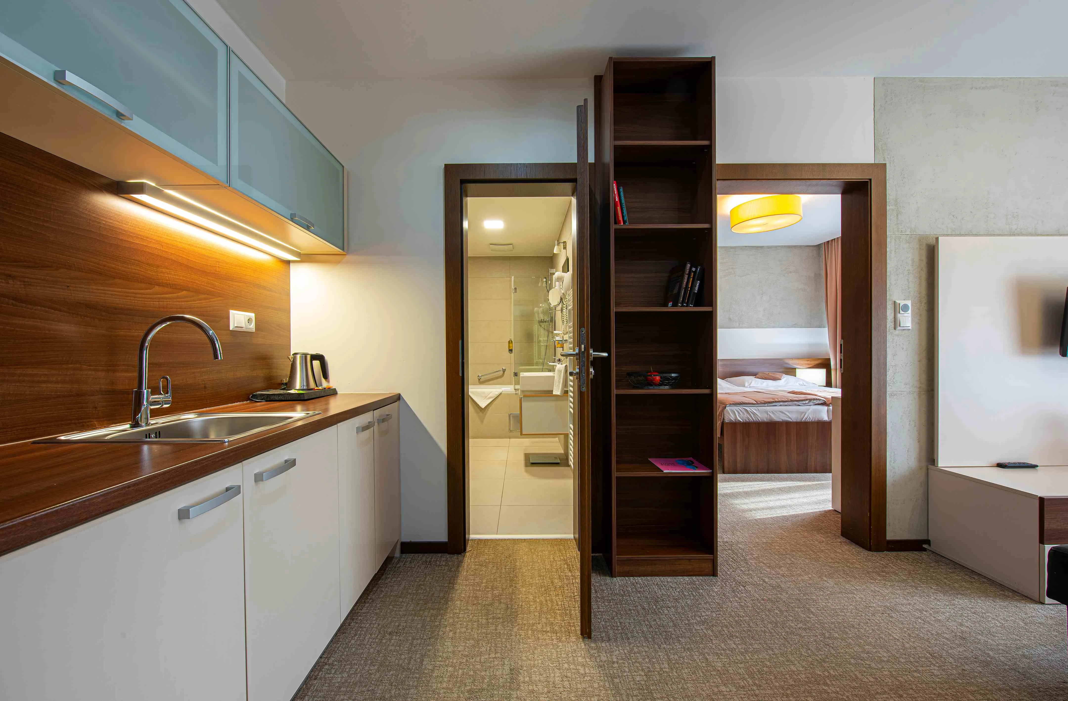 Obývacia a spálňová časť, kuchynský kút, sada na prípravu teplých nápojov, sada tanierov, šálok, príborov a pohárov (4 ks), minibar, rýchlovarná kanvica, televízor, telefón, chladnička, WC, sprcha, stolička. Súčasťou vybavenia je hotelový trezor, župan, hotelové papučky, otvárač na fľaše, hubka na čistenie obuvi. Na každé lôžko - nočný stolík alebo polička s nočnou lampou, sklenený pohár, v skrini 4 ks vešiakov, poduška a obliečka, prikrývka a obliečka. Kúpeľňa: sušič na vlasy, kozmetické zrkadlo, osobná váha, hygienické vreckovky v krabičke, odličovací set, toaletné mydlo, vlasový šampón. Na každé lôžko – 1 osuška, 1 uterák.