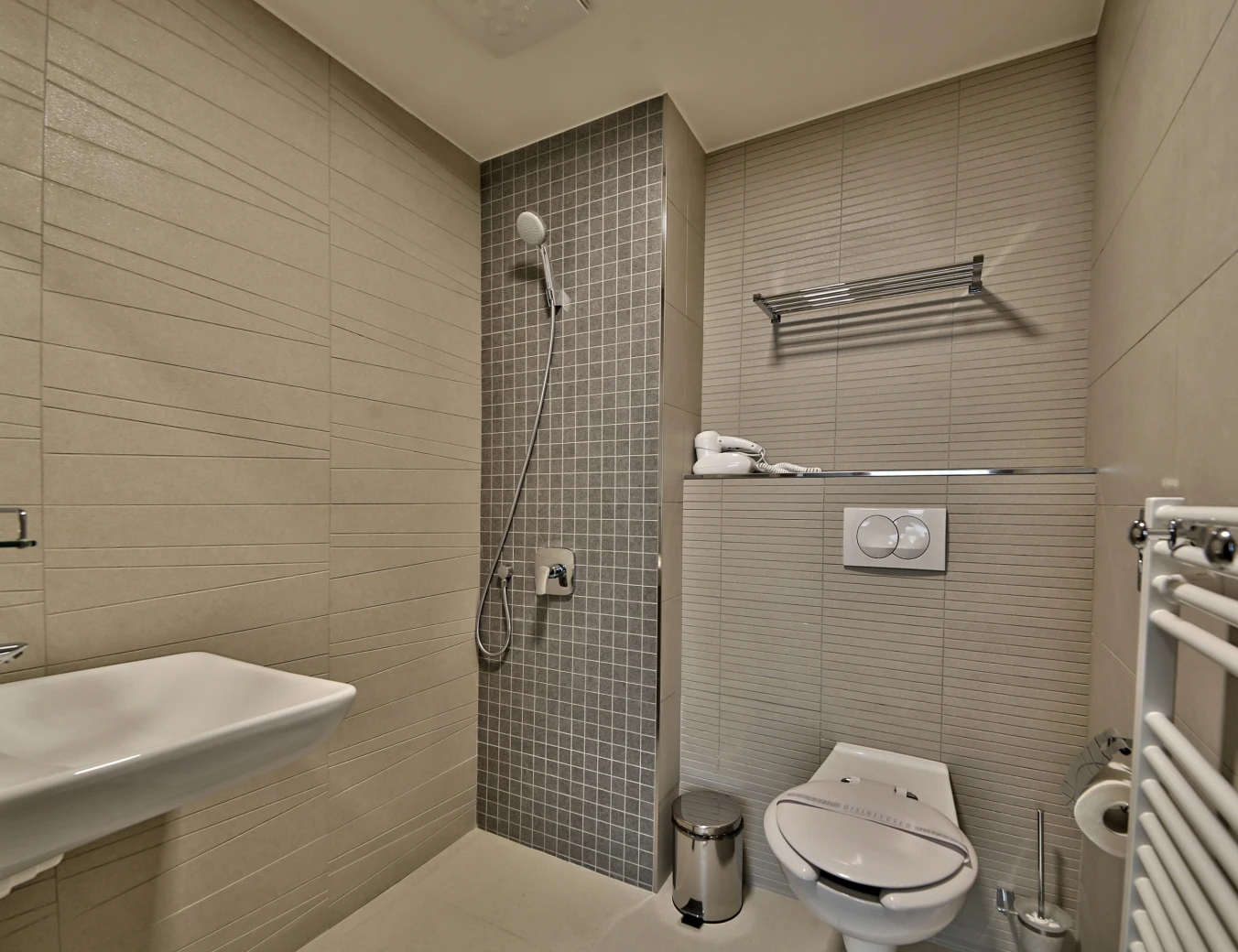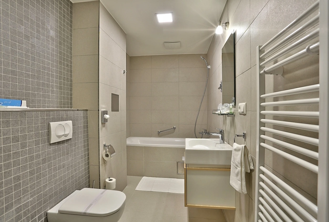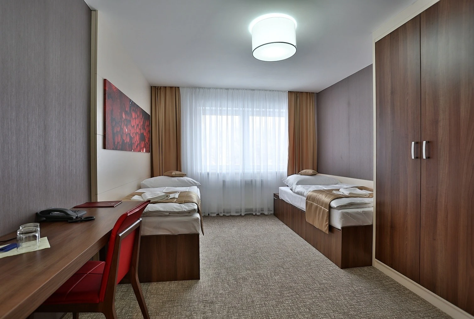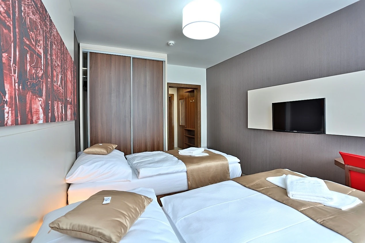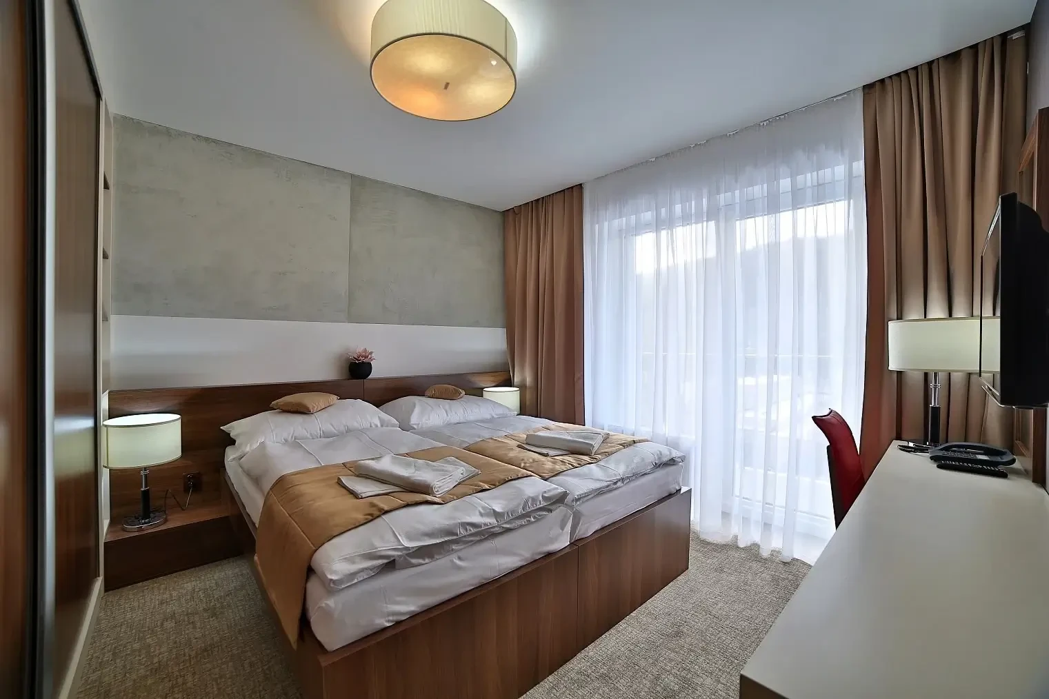 Televízor, telefón, chladnička, WC, sprcha, stolička. Súčasťou vybavenia je hotelový trezor, župan, hotelové papučky, otvárač na fľaše, hubka na čistenie obuvi. Na každé lôžko - nočný stolík alebo polička s nočnou lampou, sklenený pohár, v skrini 4 ks vešiakov, poduška a obliečka, prikrývka a obliečka. Kúpeľňa: sušič na vlasy, kozmetické zrkadlo, osobná váha, hygienické vreckovky v krabičke, odličovací set, toaletné mydlo, vlasový šampón. Na každé lôžko – 1 osuška, 1 uterák.
