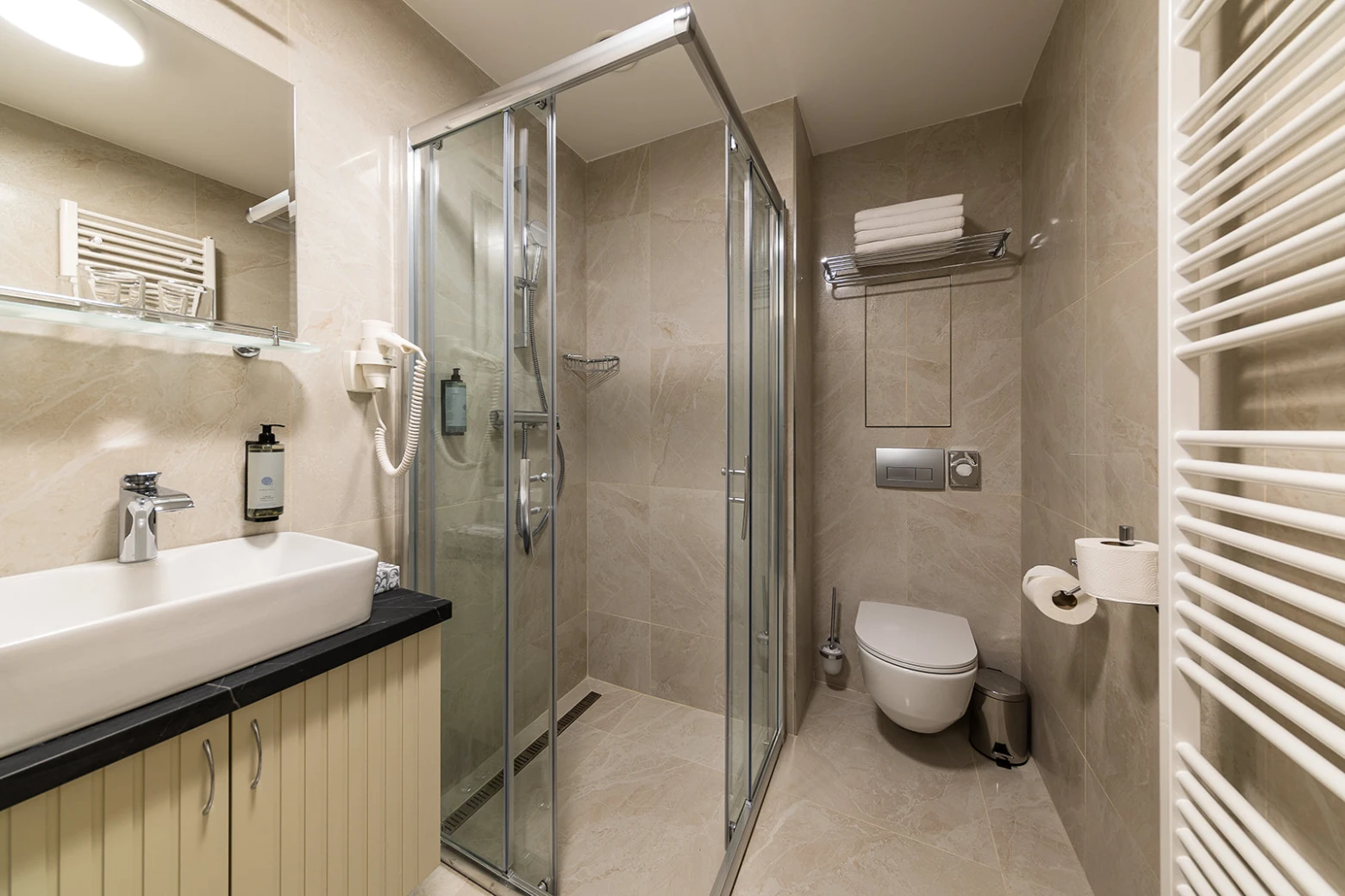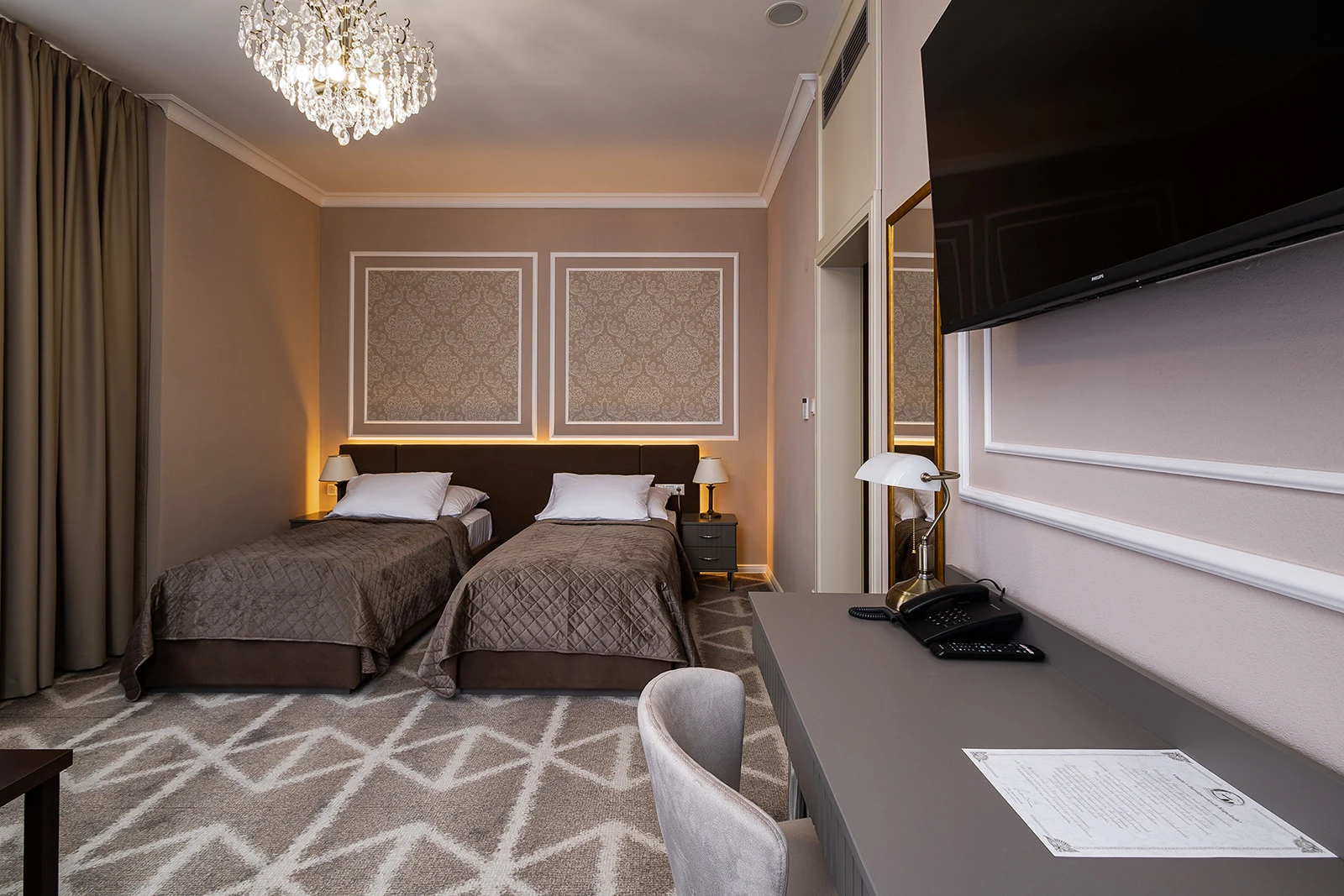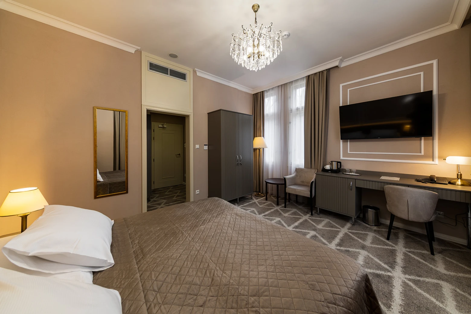 Klimatizácia, televízor, telefón, chladnička, WC, sprcha. Súčasťou vybavenia je rýchlovarná kanvica, bezpečnostný trezor na izbe, župan, hotelové papučky. Na každé lôžko - 1 osuška, 1 uterák. Kúpeľňa: sušič na vlasy, kozmetické zrkadlo, osobná váha, hygienické vreckovky v krabičke, odličovací set, toaletné mydlo, vlasový a telový šampón.