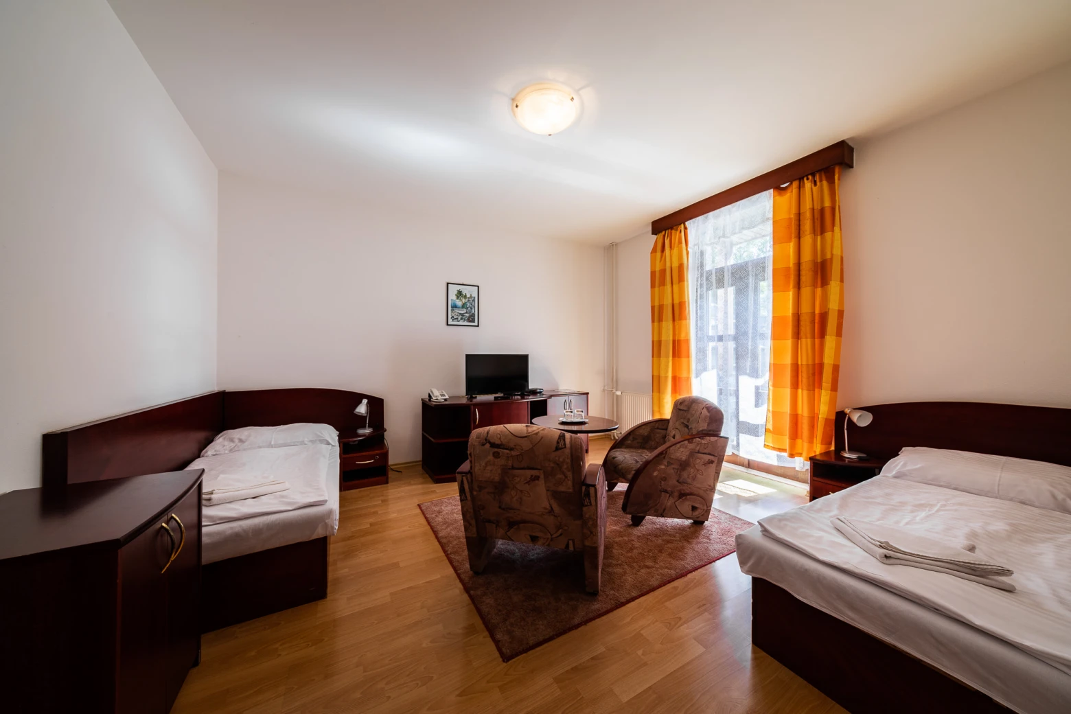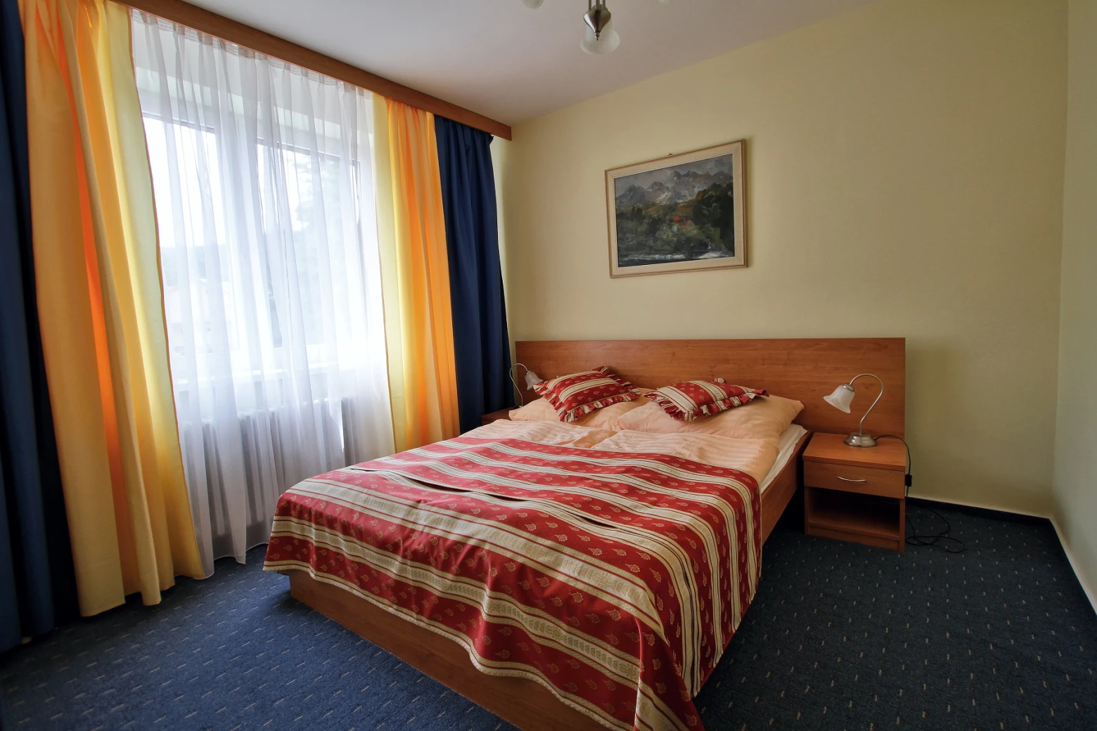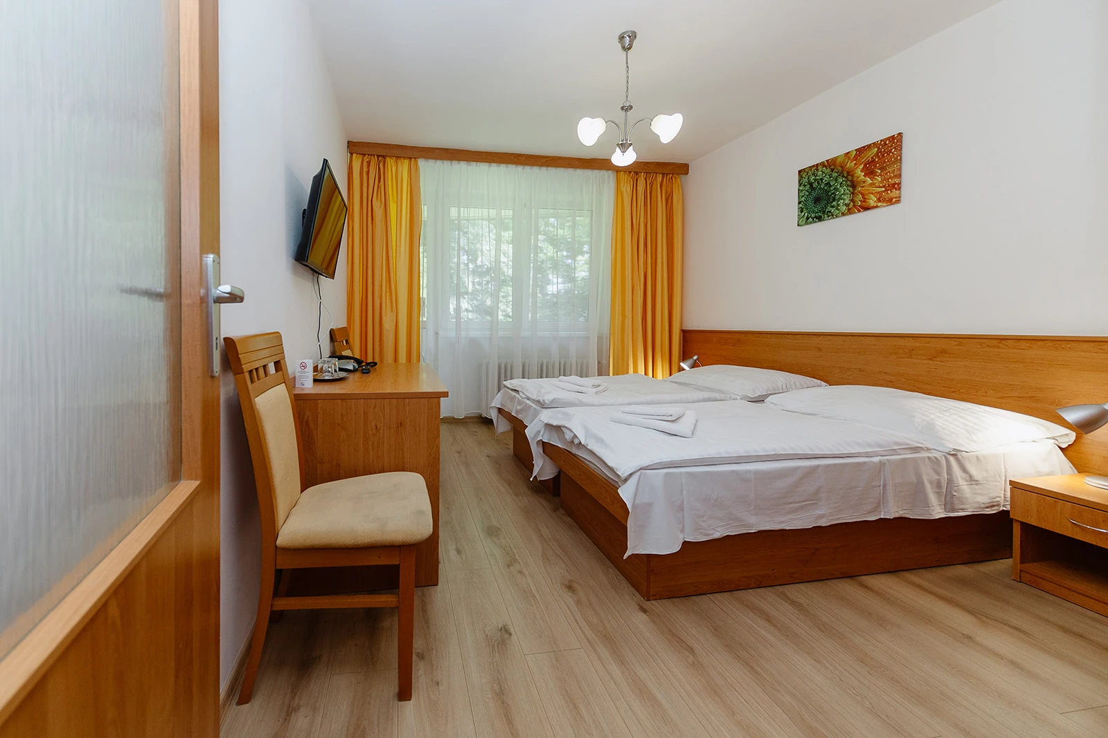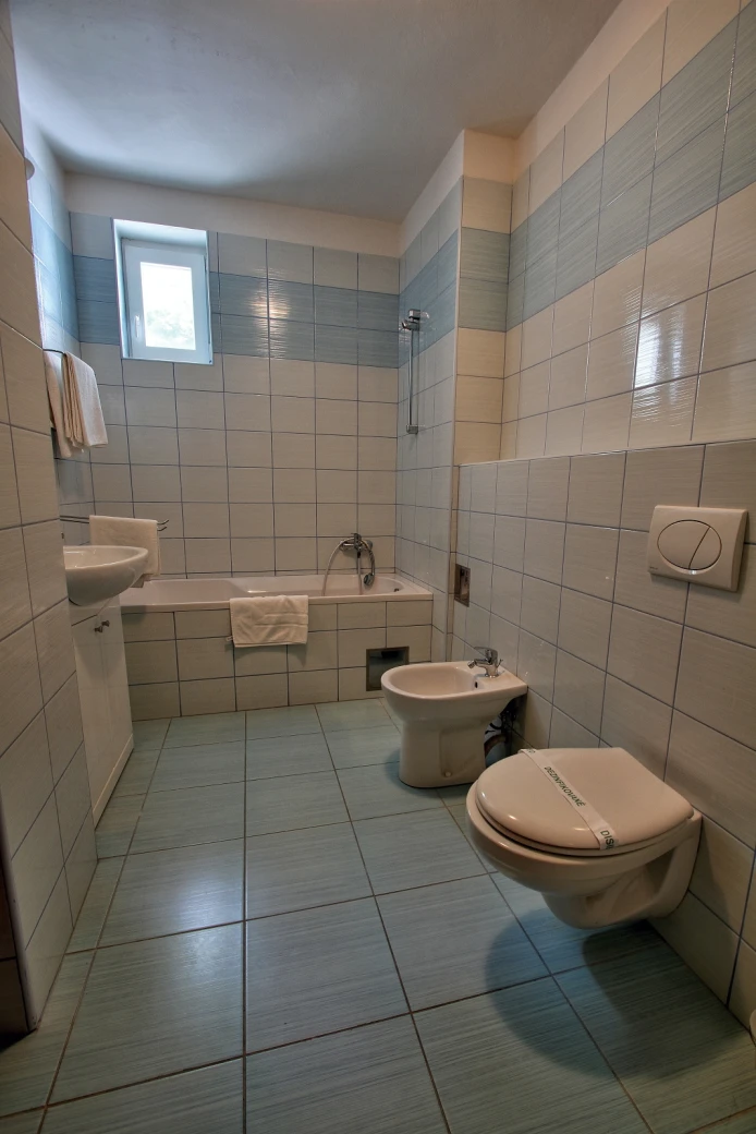 Televízor, telefón, chladnička, WC, sprcha /vaňa. Na každé lôžko - nočný stolík alebo polička s nočnou lampou, sklenený pohár, kreslo alebo stolička, v skrini 4 ks vešiakov, poduška a obliečka, prikrývka a obliečka, 1 osuška, 1 uterák, sklenený pohár, toaletné mydlo, vlasový šampón. Súčasťou vybavenia je otvárač na fľaše, hubka na čistenie obuvi.