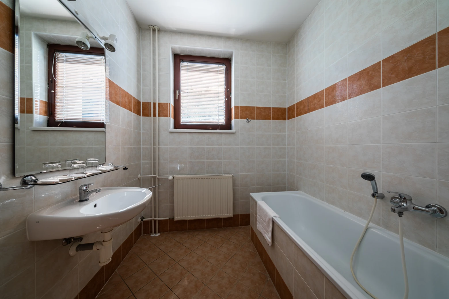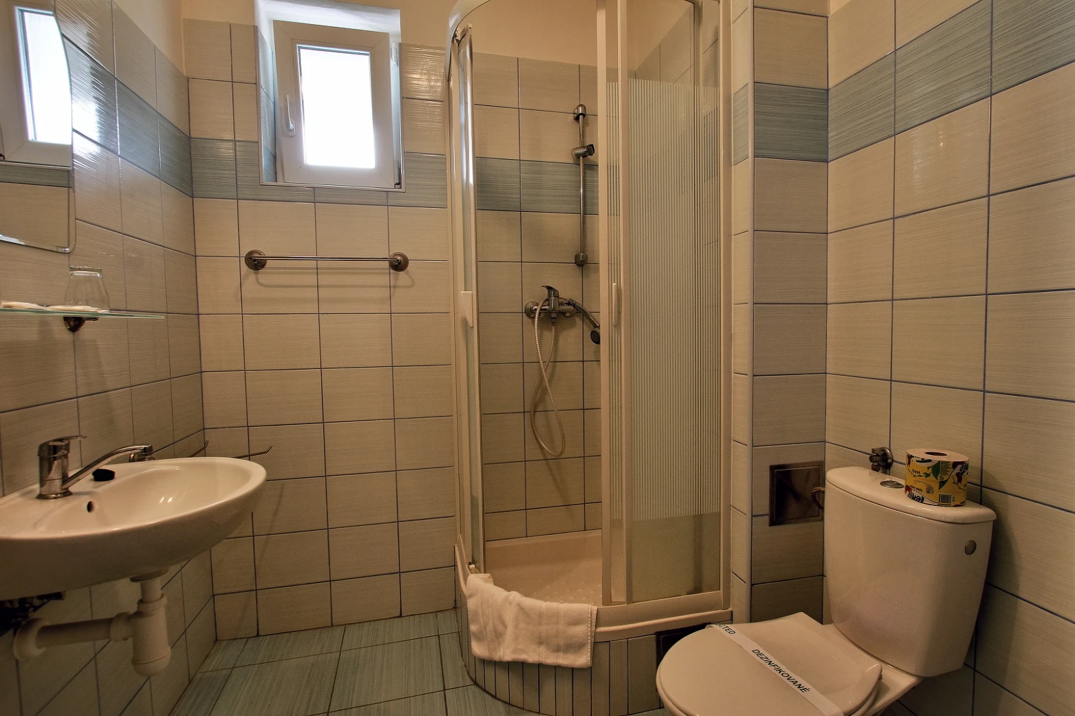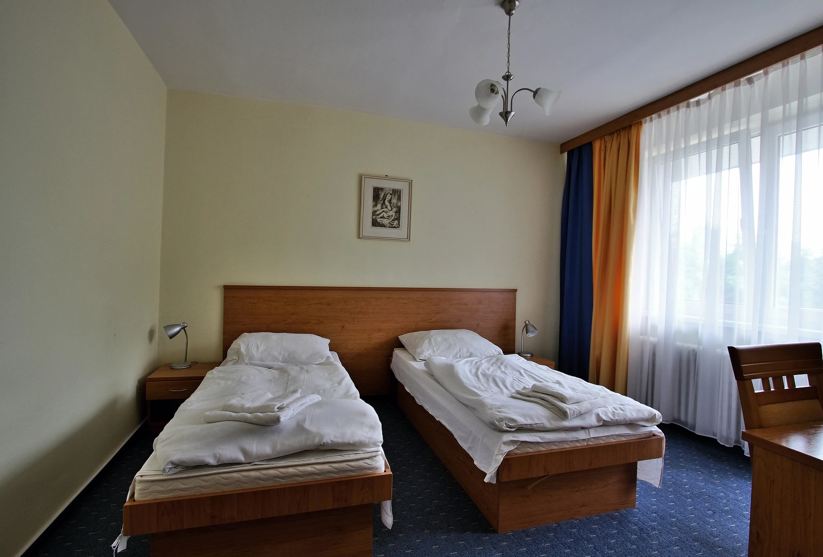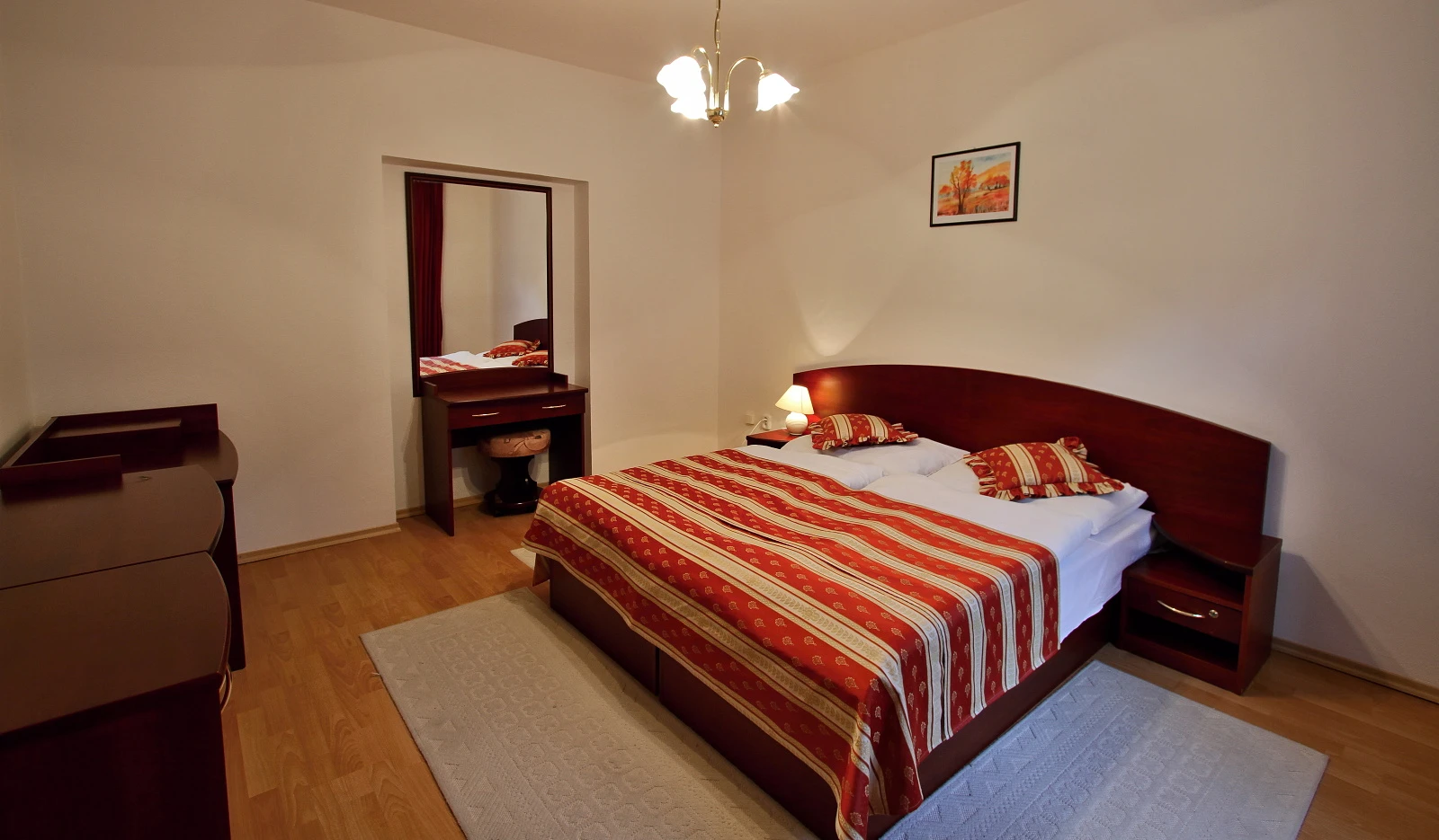 Televízor, telefón, chladnička, WC, sprcha /vaňa. Na každé lôžko - nočný stolík alebo polička s nočnou lampou, sklenený pohár, kreslo alebo stolička, v skrini 4 ks vešiakov, poduška a obliečka, prikrývka a obliečka, 1 osuška, 1 uterák, sklenený pohár, toaletné mydlo, vlasový šampón. Súčasťou vybavenia je otvárač na fľaše, hubka na čistenie obuvi.