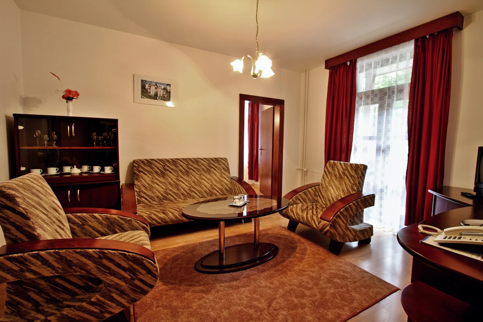 Obývacia a spálňová časť, rozkladacia pohovka, rýchlovarná kanvica, televízor, telefón, chladnička, WC, sprcha/vaňa, hotelový trezor. Súčasťou vybavenia je župan, hotelové papučky, otvárač na fľaše, hubka na čistenie obuvi. Na každé lôžko - nočný stolík alebo polička s nočnou lampou, sklenený pohár, kreslo alebo stolička, v skrini 4 ks vešiakov, poduška a obliečka, prikrývka a obliečka. Kúpeľňa: sušič na vlasy, kozmetické zrkadlo, osobná váha, toaletné mydlo, telové mlieko, vlasový šampón. Na každé lôžko – 1 osuška, 1 uterák.
